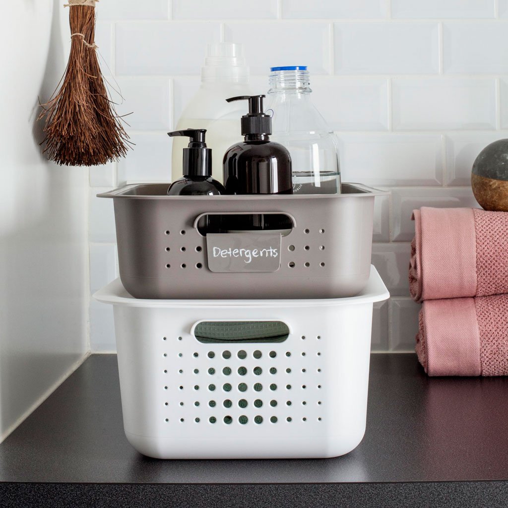 Košíky – plastové košíky pro domácnost ve 3 velikostech a dvou barvách jsou vhodné pro každodenní skladování čehokoli, co potřebujete mít stále po ruce. Krabice na ponožky, organizéry na spodní prádlo, úložné boxy na domácí potřeby – to vše mohou nahradit nebo vhodně doplnit tyto univerzální koše.